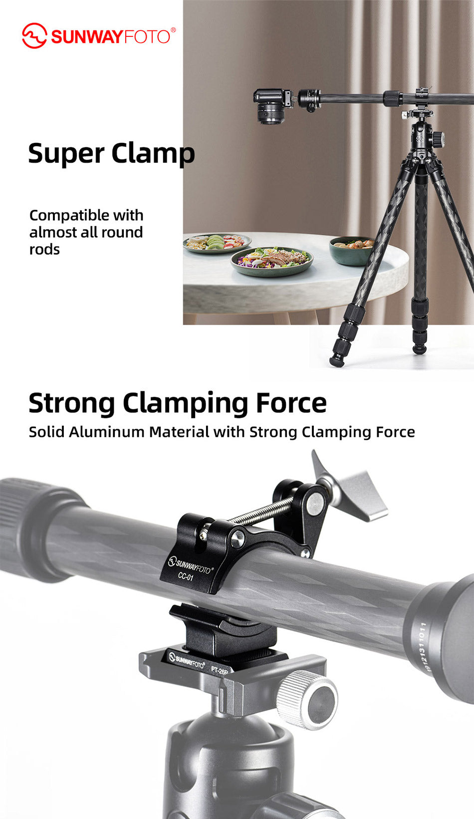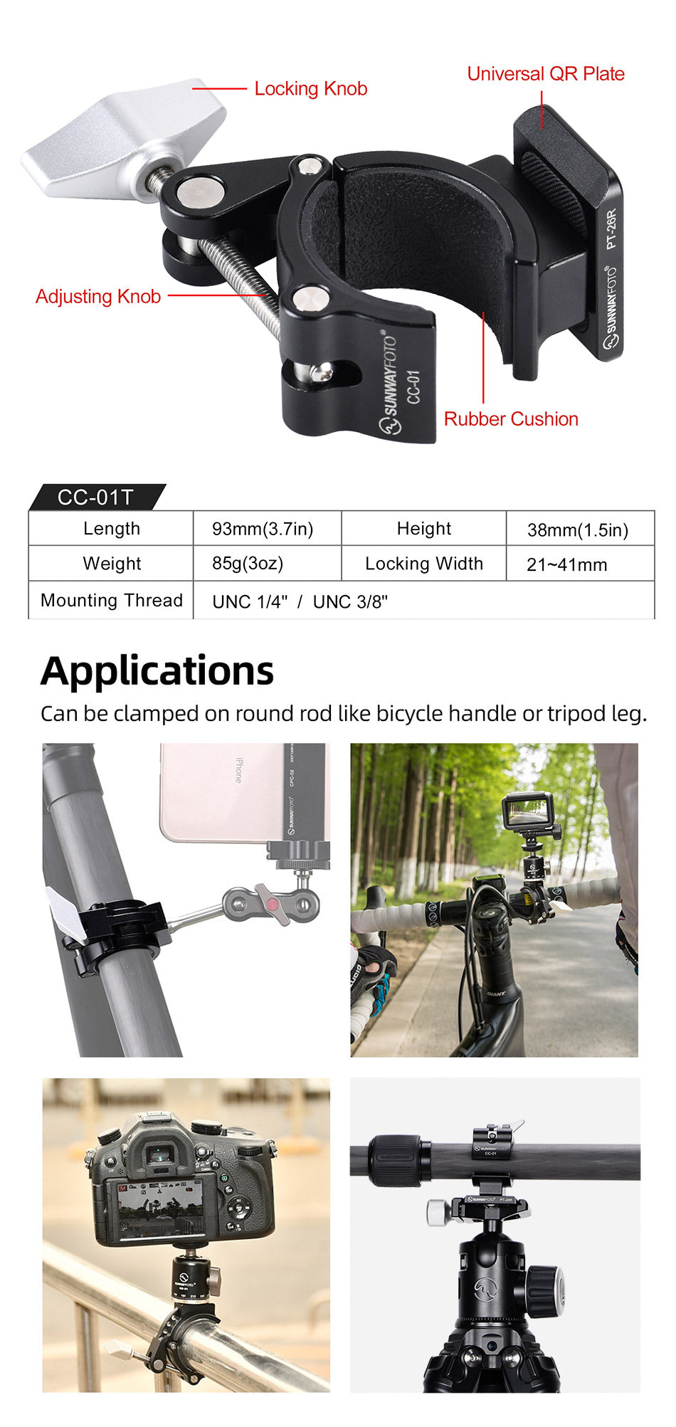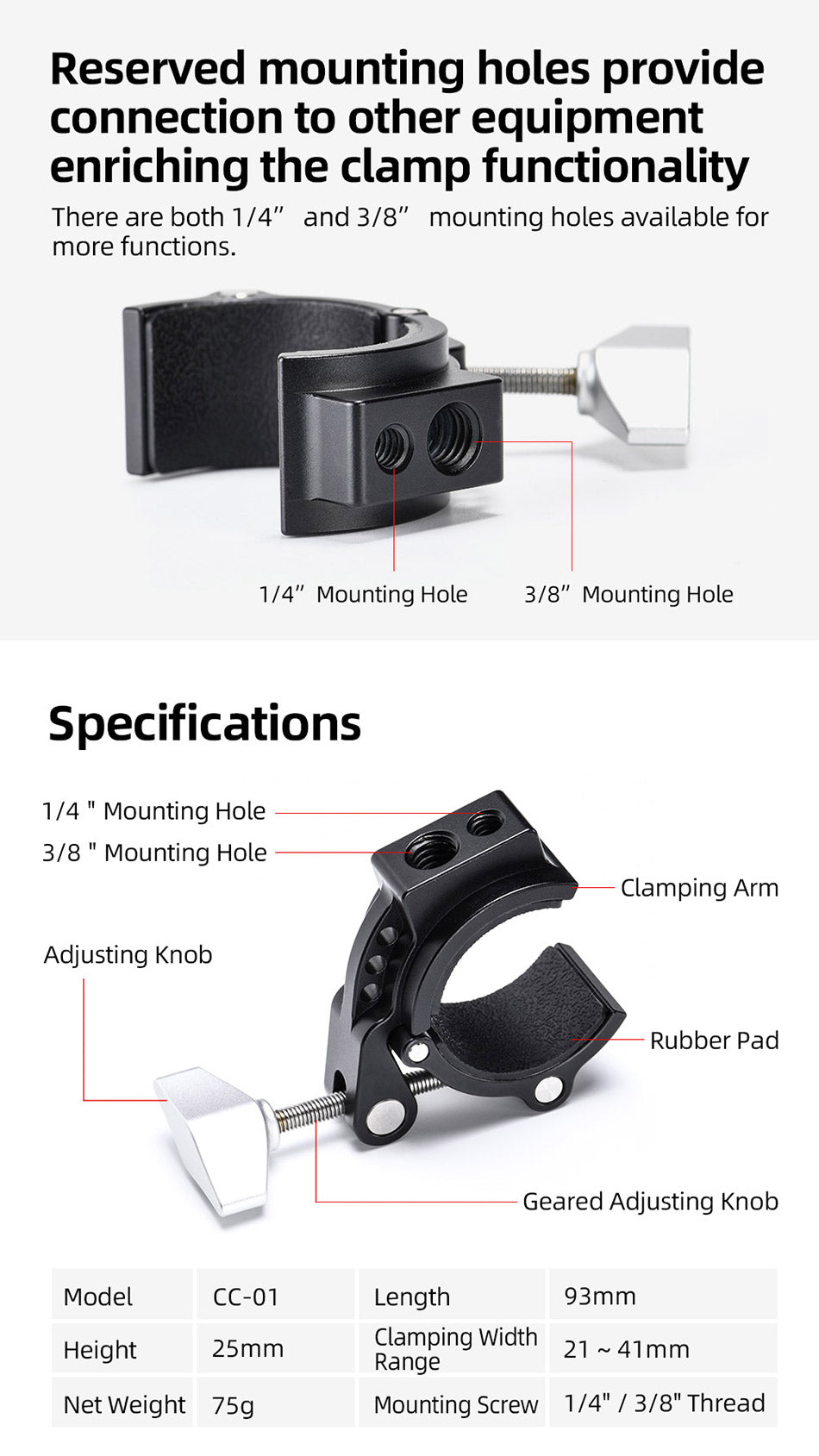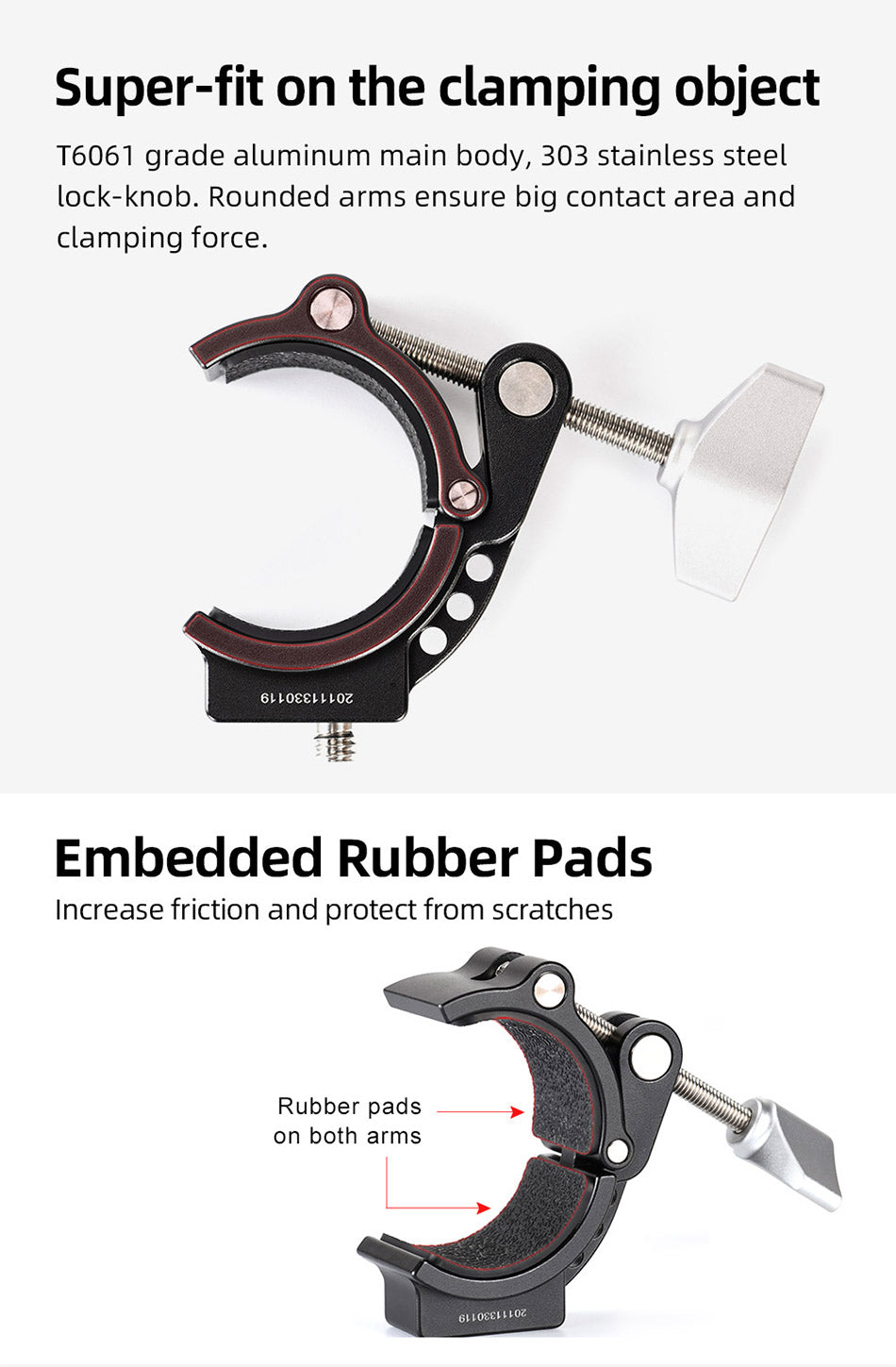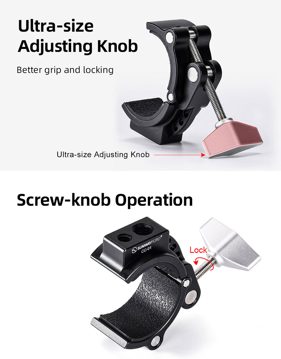 ✪Knurling rubber pads inside the clamping surface to increase friction for better stability and at the same time protects the equipment from scratches. Both 1/4” and 3/8” screw holes available, included with 1/4” and 3/8” bushing so the CC-01 is compatible with more different photographic accessories.