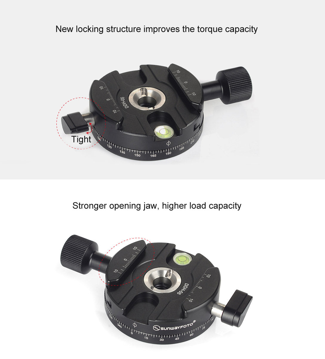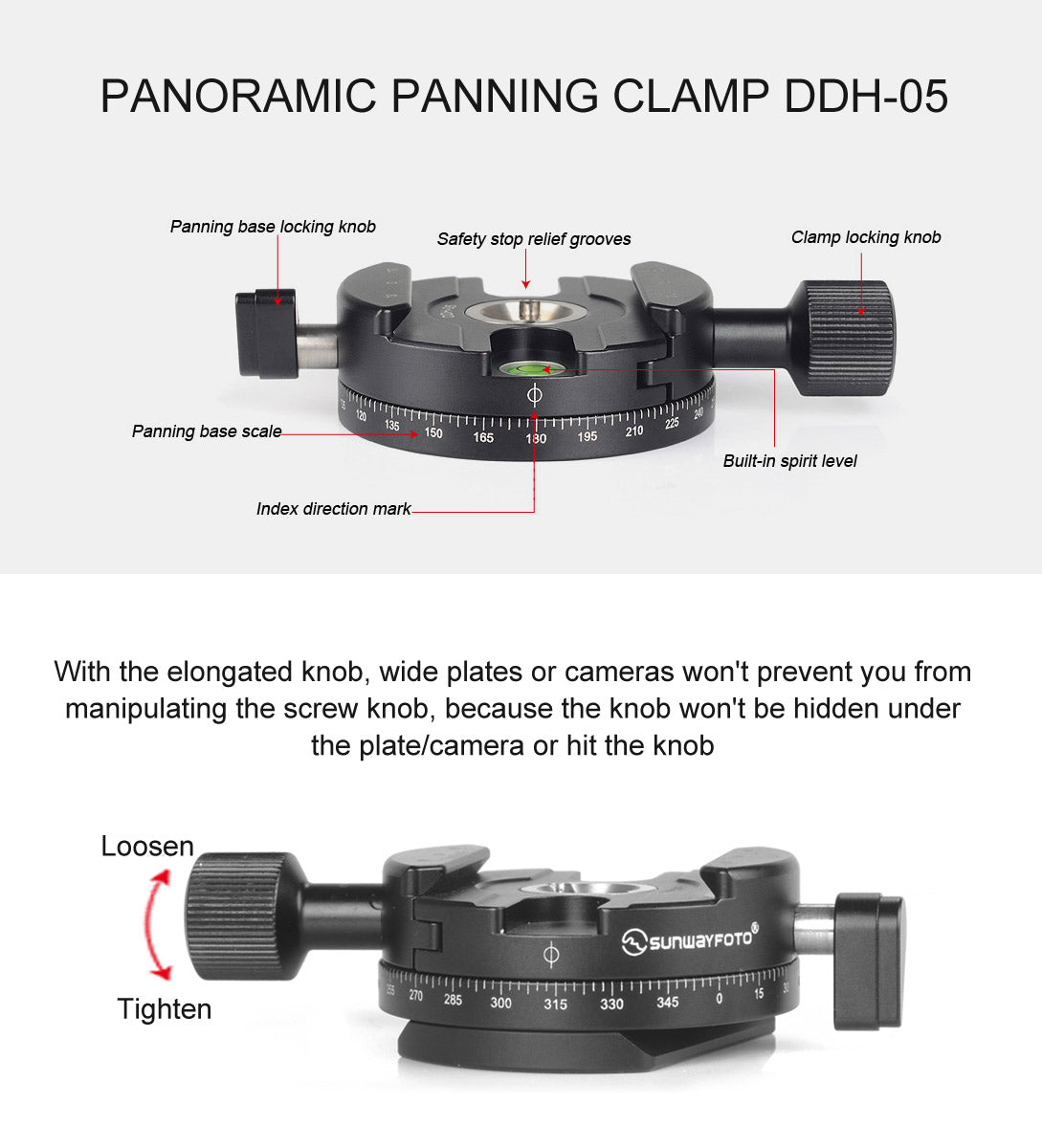 SUNWAYFOTO DDH-05N Precision Panning Base with integral clamp and bubble level for smooth and level panning.