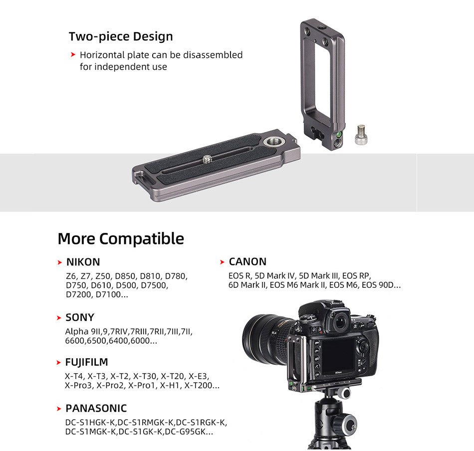 ✪Compatible with most DSLR in the market, including Nikon D810, D850, Canon 5DIII, 5DIV, Sony A7RIII, A7RIV etc. cameras. Aero-space grade aluminum material, elaborately CNC machined, high quality type-III hard-anodized finish ensures it's abrasion and corrosion resistant.