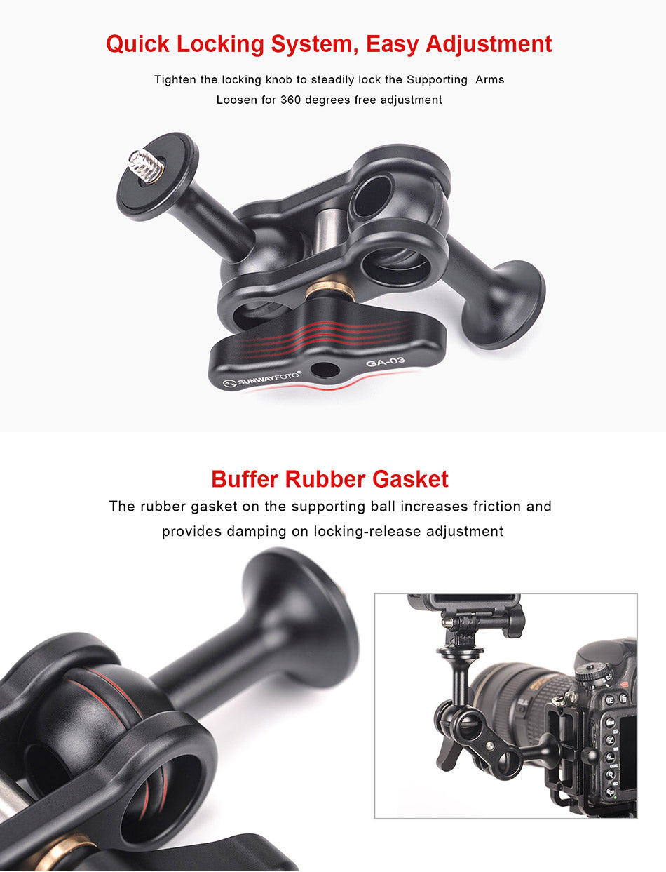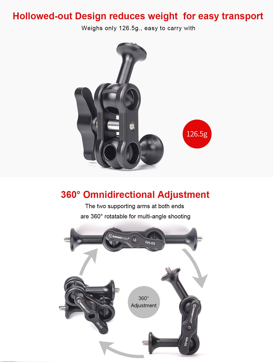 ✪Dual-ball design: 360 degrees rotatable dual-ball design, by rotating the ball and adjust the position and angle of the mounting shaft to reach an ideal angle, especially suitable when more equipment work together.