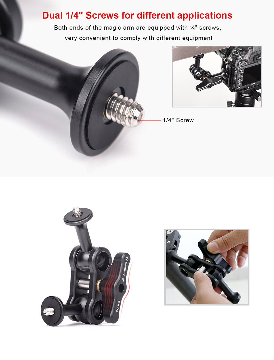✪Widely compatible: 1/4” screw at both sides to work with many different photographic accessories, such as tripod, super clamp, L-bracket, cage, camera handheld grip, mirrorless mountable phone, LED video light, microphone, monitor, stabilizer, GOPRO and DJI OSMO.