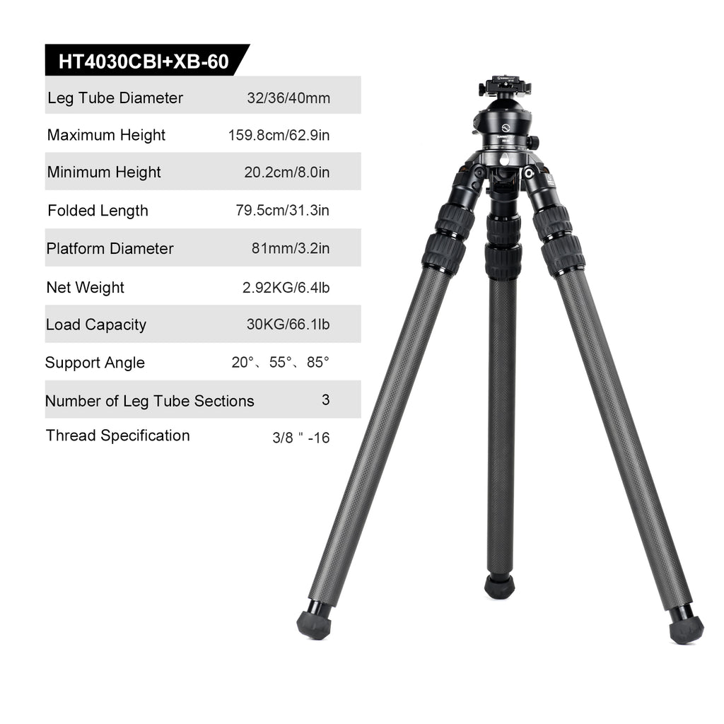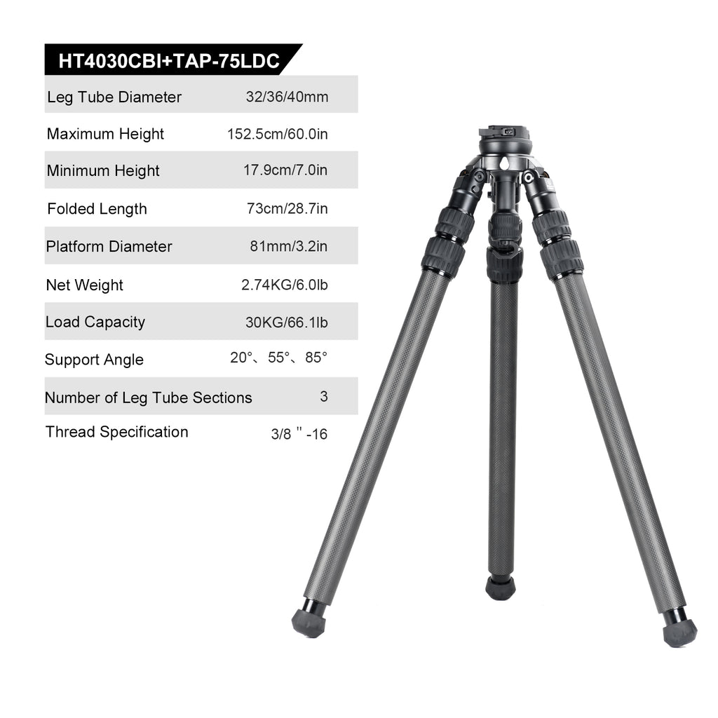 SUNWAYFOTO HT4030CBI Inverted Leg Carbon Fiber Heavy Duty Tripod with 65mm Bowl , 40mm, 3 Sections, 59'' (150cm) Tall, Load 66lb.(30kg)