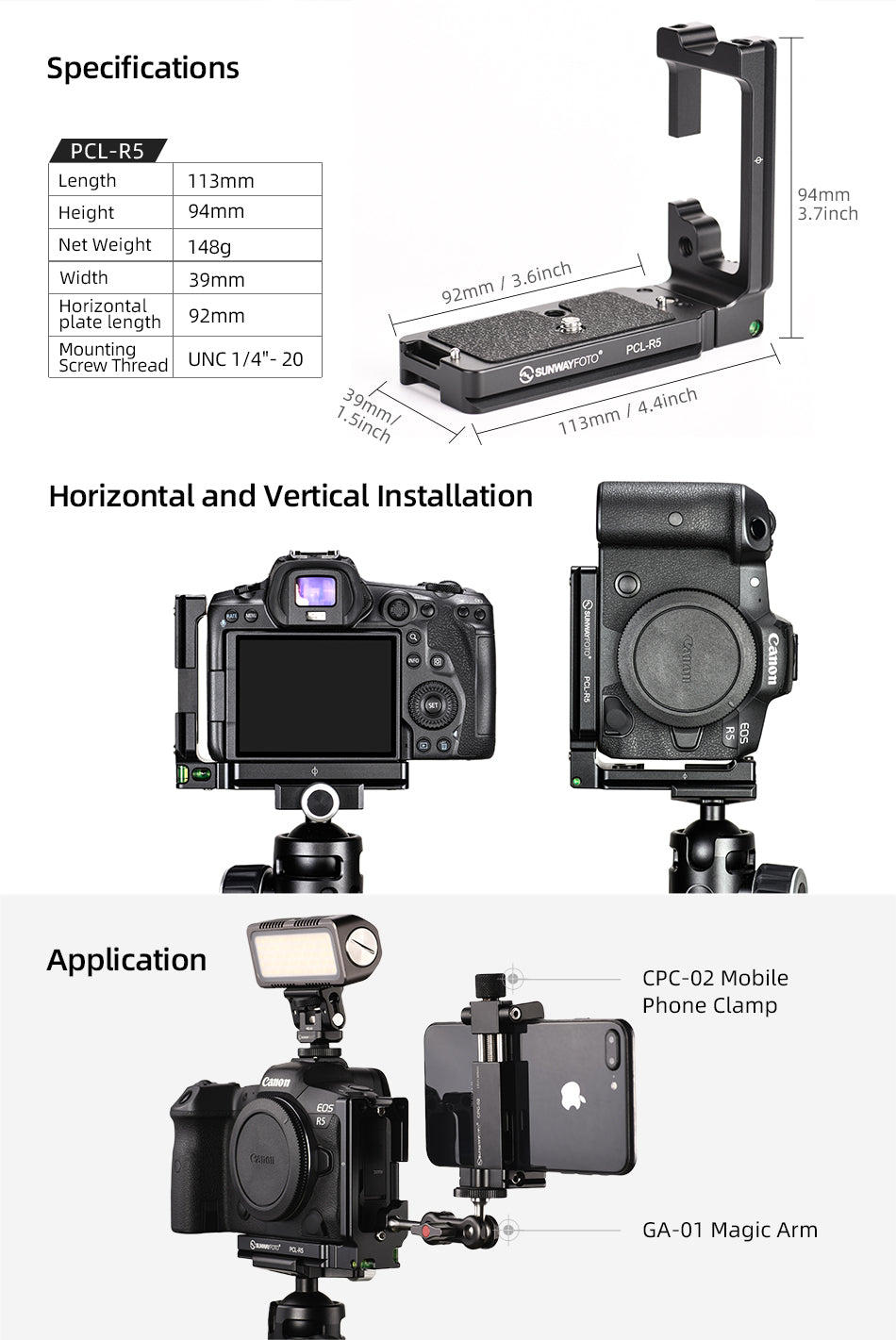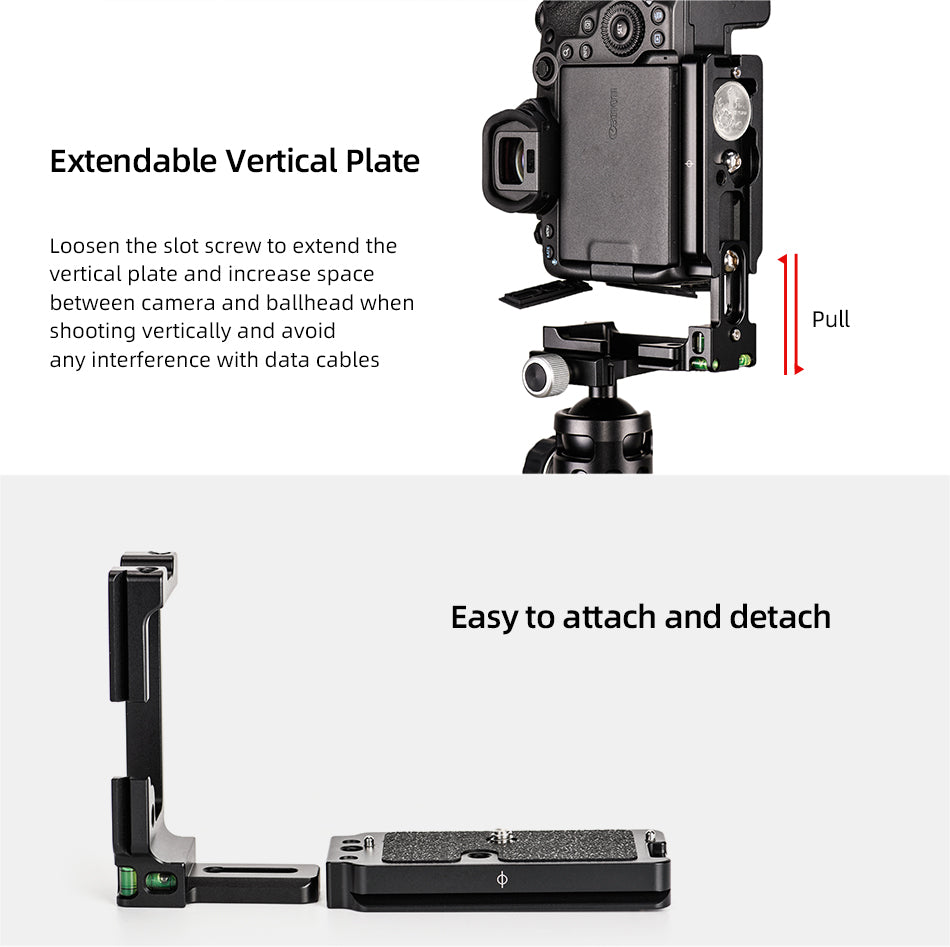 ✪The L-bracket consists of two parts of a horizontal plate and a vertical one, both can be detached and use independently when lighter weight needed. Easy to attach and detach.