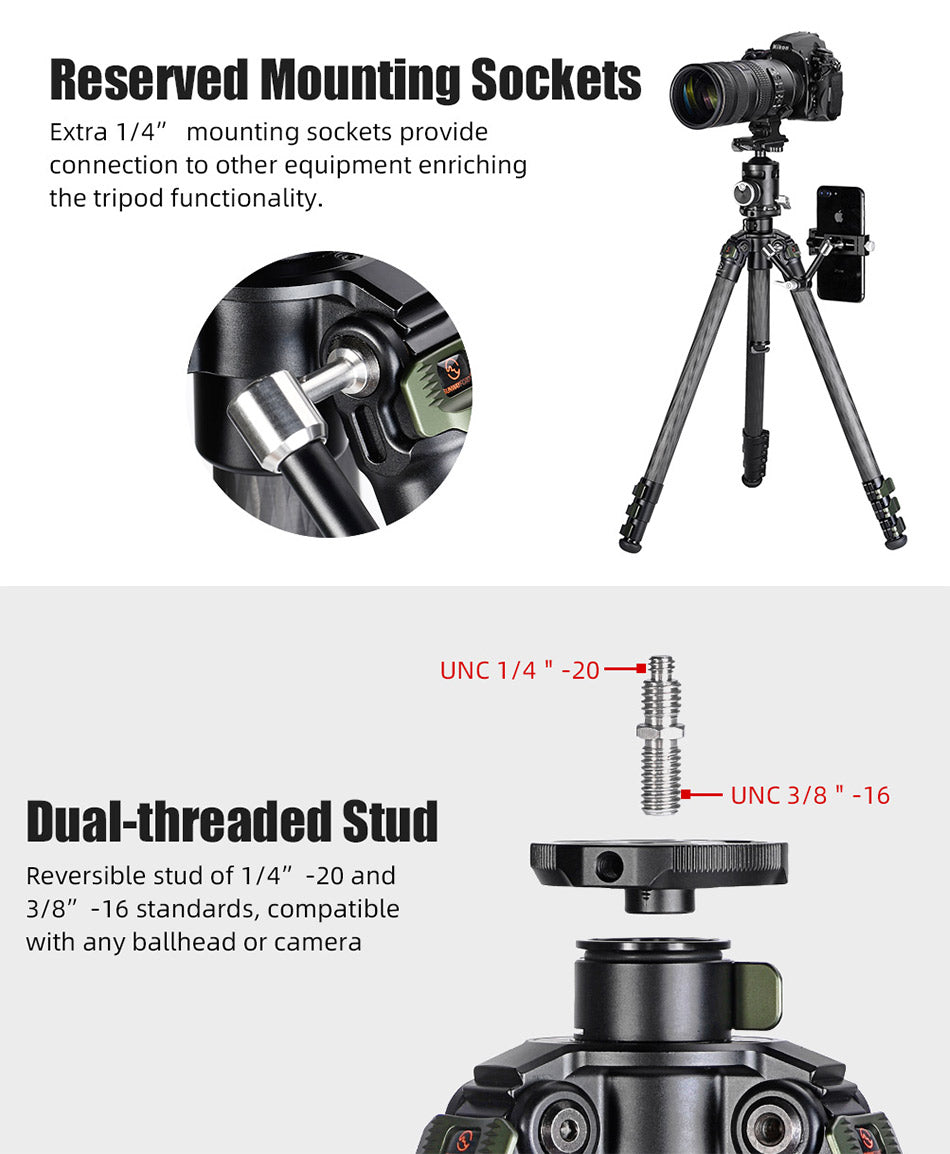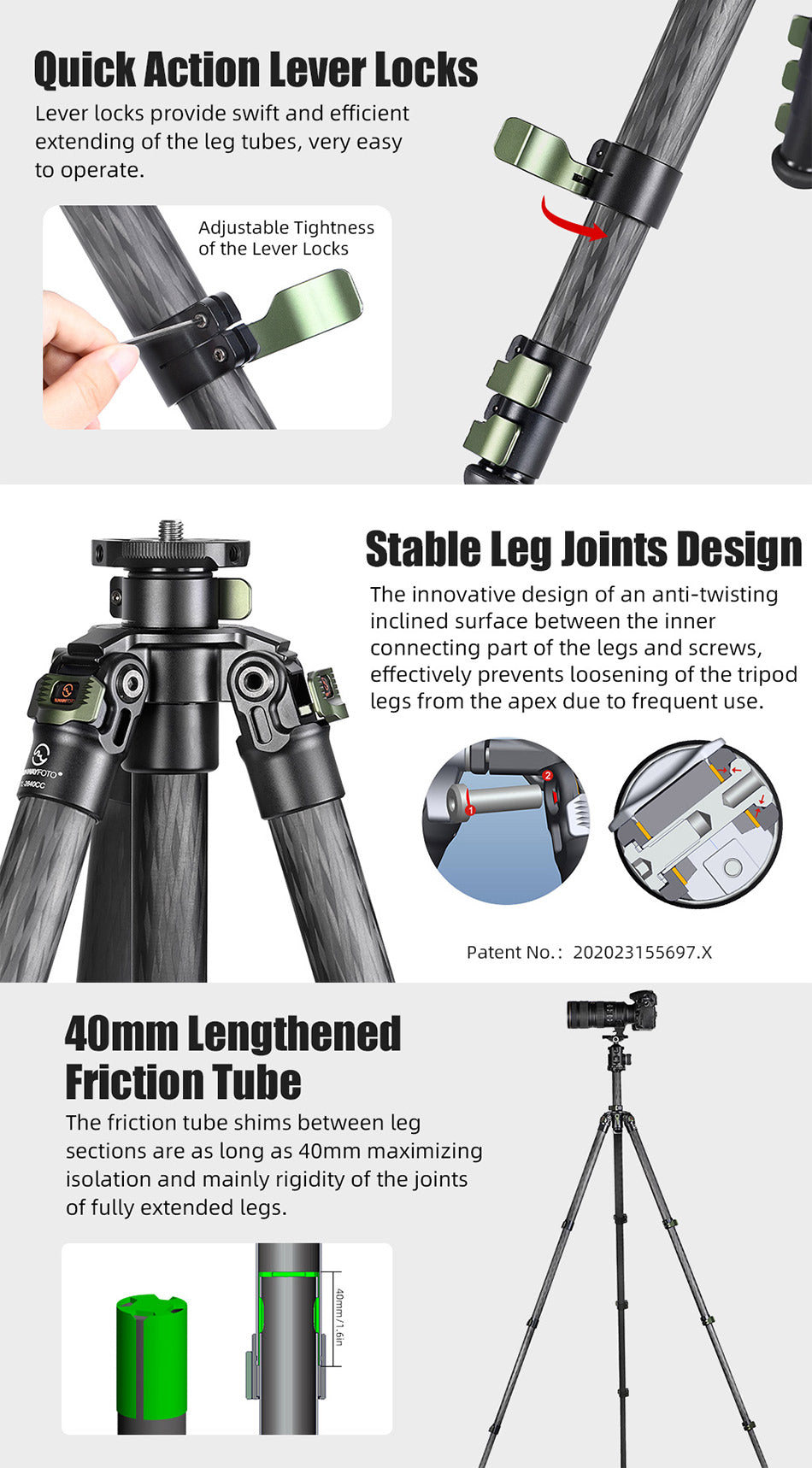 ✪Tripod tubes feature lever-release locks for swift tightening, easy to operate and the tightness of the lever-locks are adjustable.