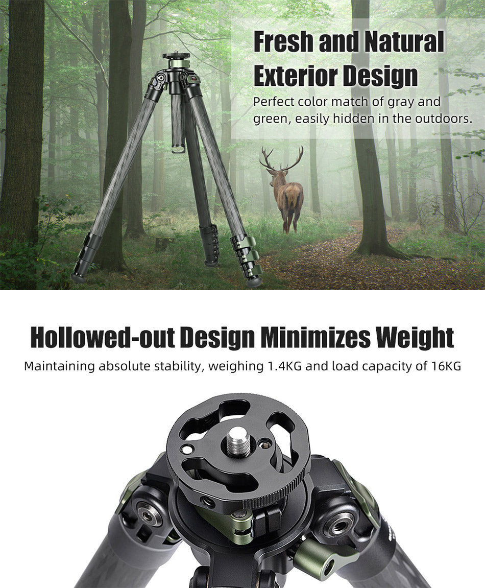 ✪T6061 grade aluminum platform, carbon fiber tripod tubes; Net weight 3lb(1.4KG), max load capacity of 35lb(16KG);