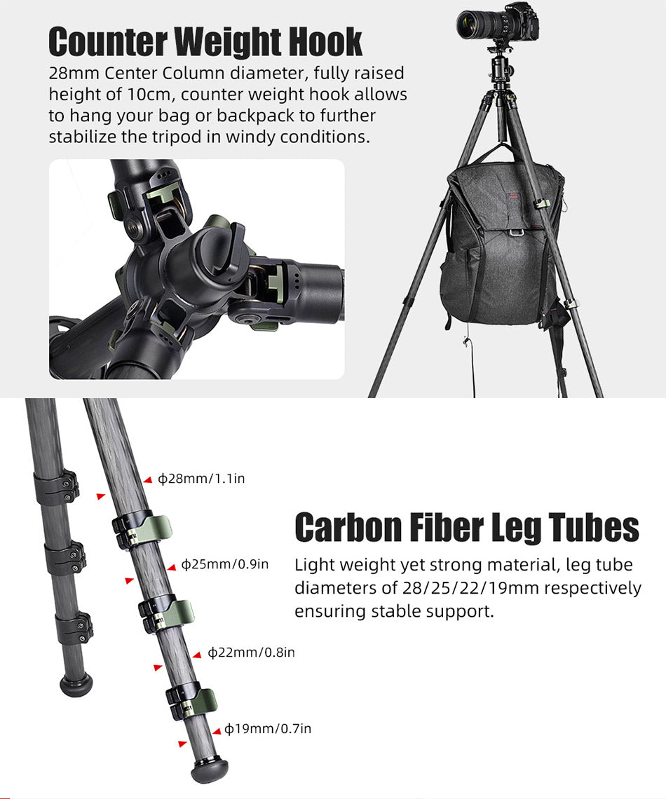 ✪Center column diameter is 28mm, max height raised is 3.9”(10cm), counter-weight hook can be used to hang your bag or backpack to further stabilize the tripod in windy conditions.