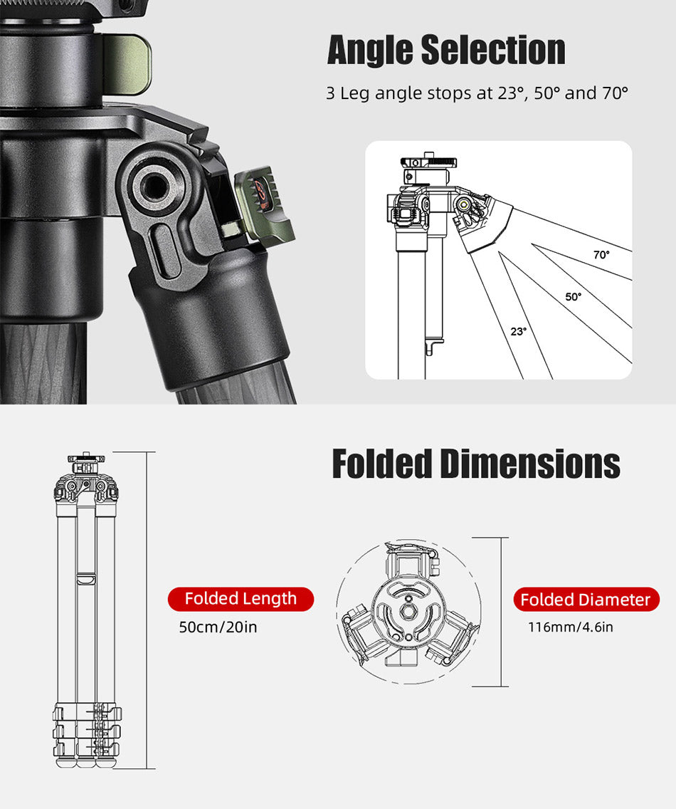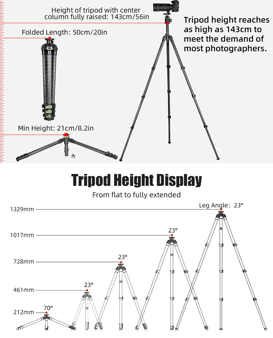 ✪Folded length 20”(50cm), Height of tripod with legs fully extended 56”(143cm), and min height goes to 8.3”(21cm)
