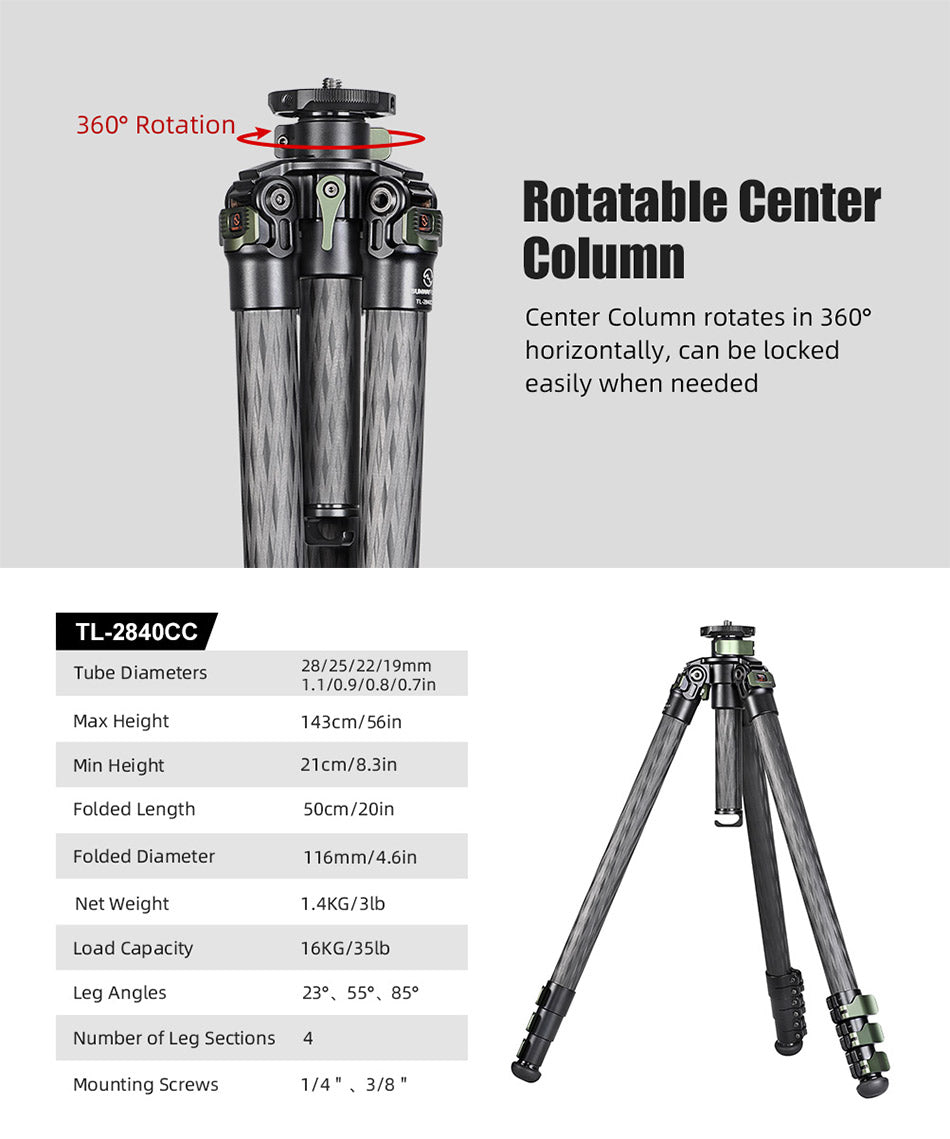✪TL2840CC tripod is dedicated to traveling. Featuring Sunwayfoto’s sealed lock weatherproofing system, which effectively prevents water, sand or dust from entering the locks and tubes, in this way ensuring the tripod is ideal to be used under severe environment outdoors. Compared with traditional tripods, the lever-locks provide efficient quick locking.