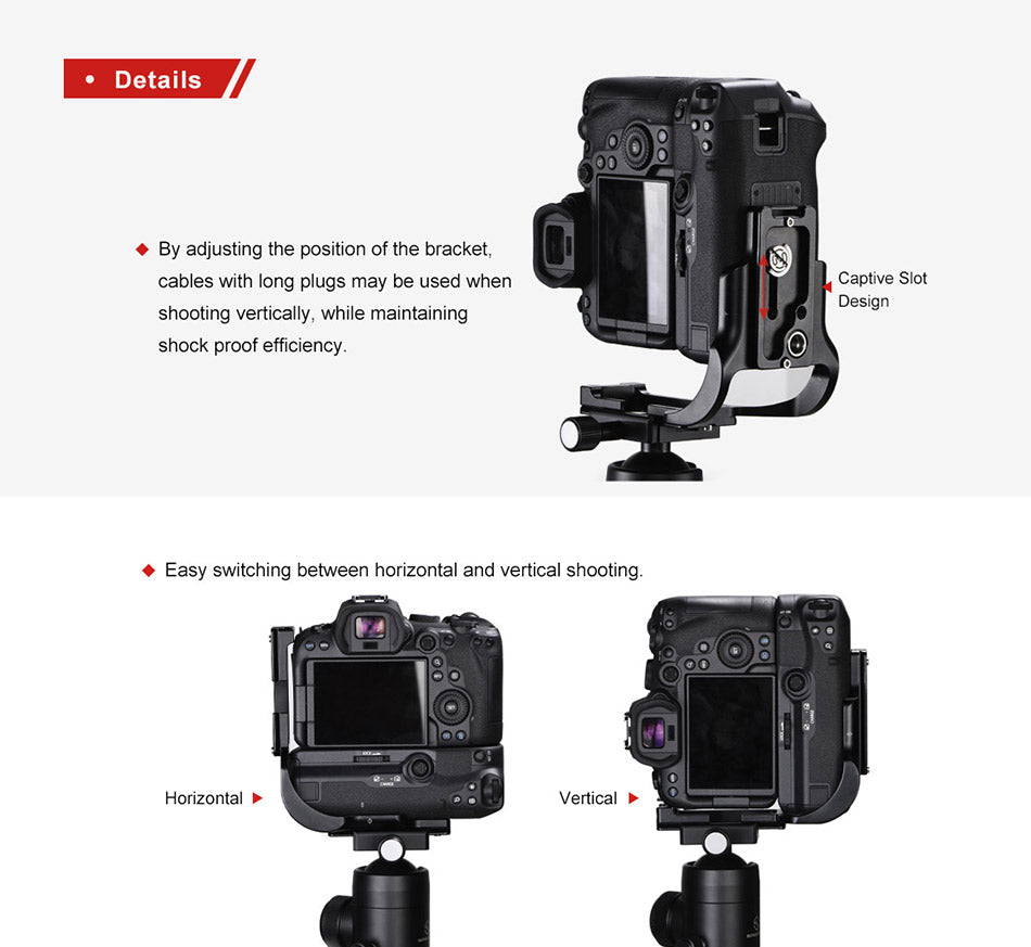 By adjusting the position of the bracket, cables with long plugs may be used when shooting vertically, while maintaining shock proof efficiency.