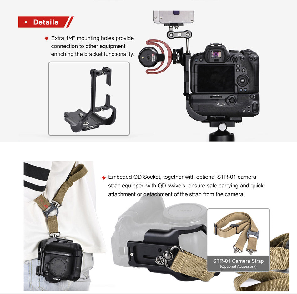 Embeded QD Socket, together with optional STR-01 camera strap equipped with QD swivels, ensure safe carrying and quick attachment or detachment of the strap from the camera.