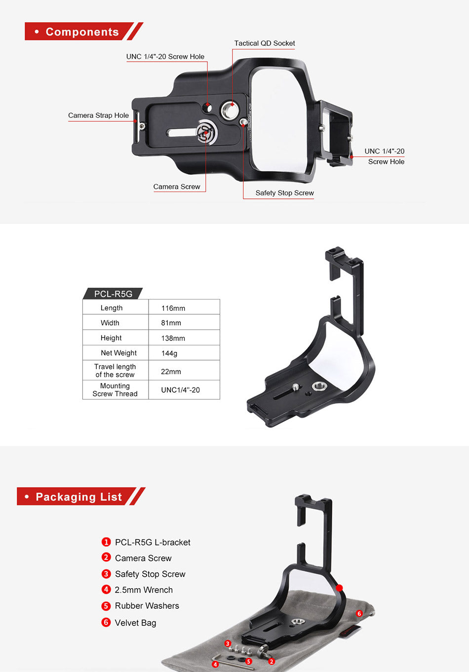 If you are looking for custom L-bracket for the Canon R5/R6/R5C camera body only then choose the PCL-R5,PCLO-R5 will do.