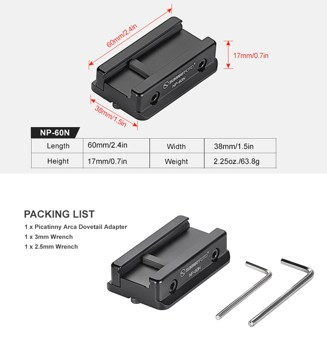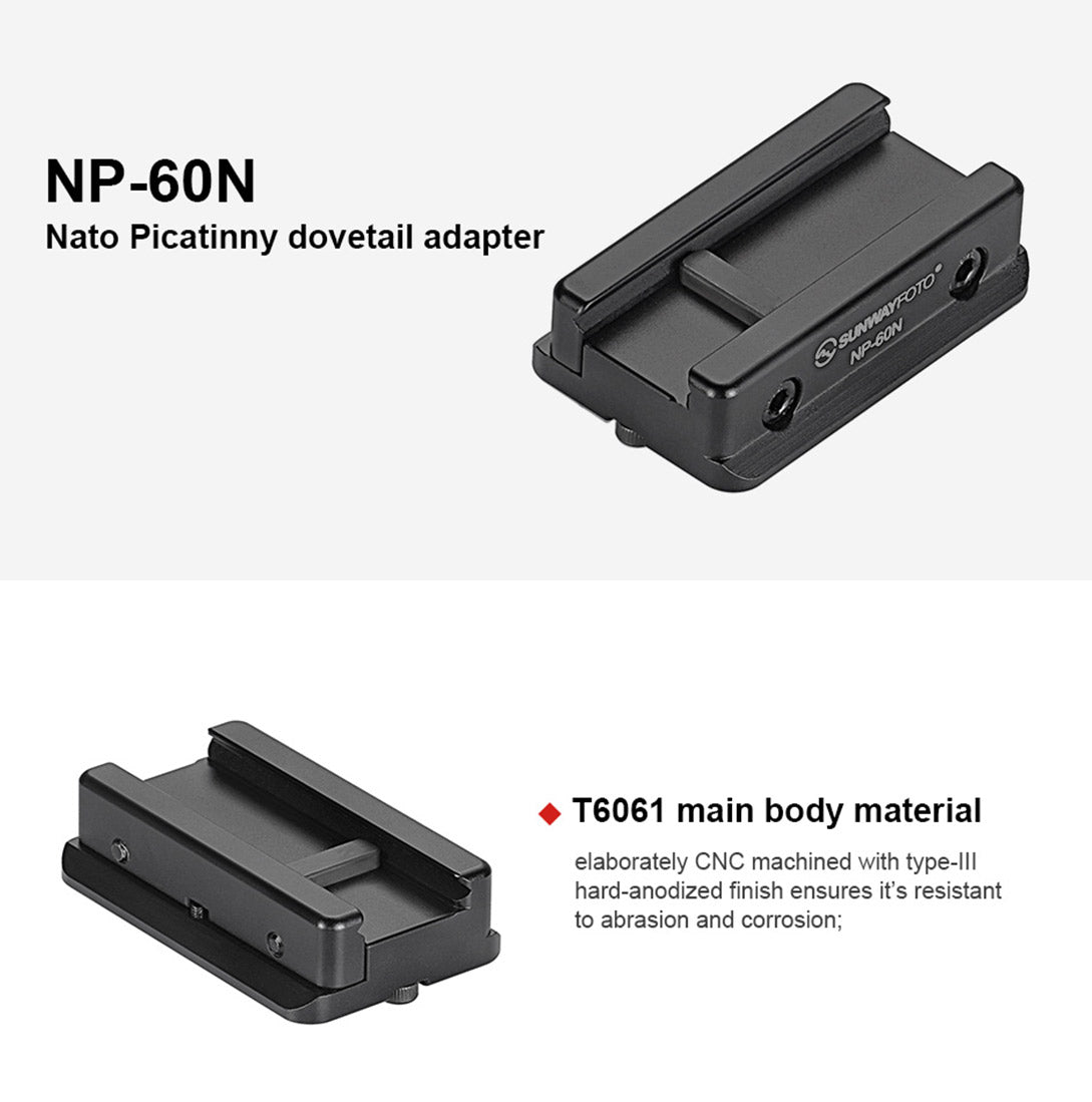 ✪Base structure is compatible with both Arca and RRS dovetail, design of top works with NATO/Picatinny rails.Safety stop screws at both ends of the base to avoid accidental dropping from Arca or RRS ballhead clamps.