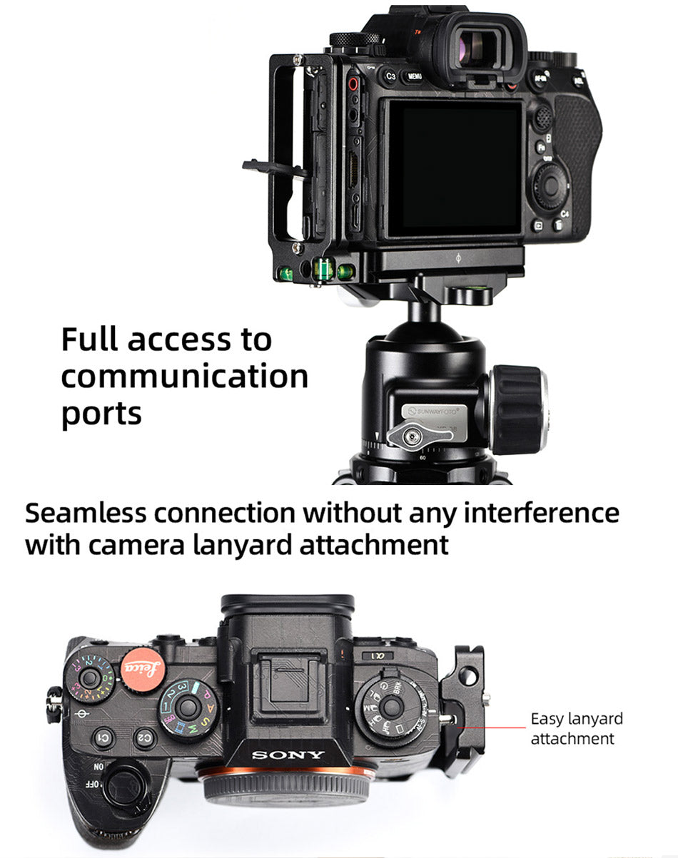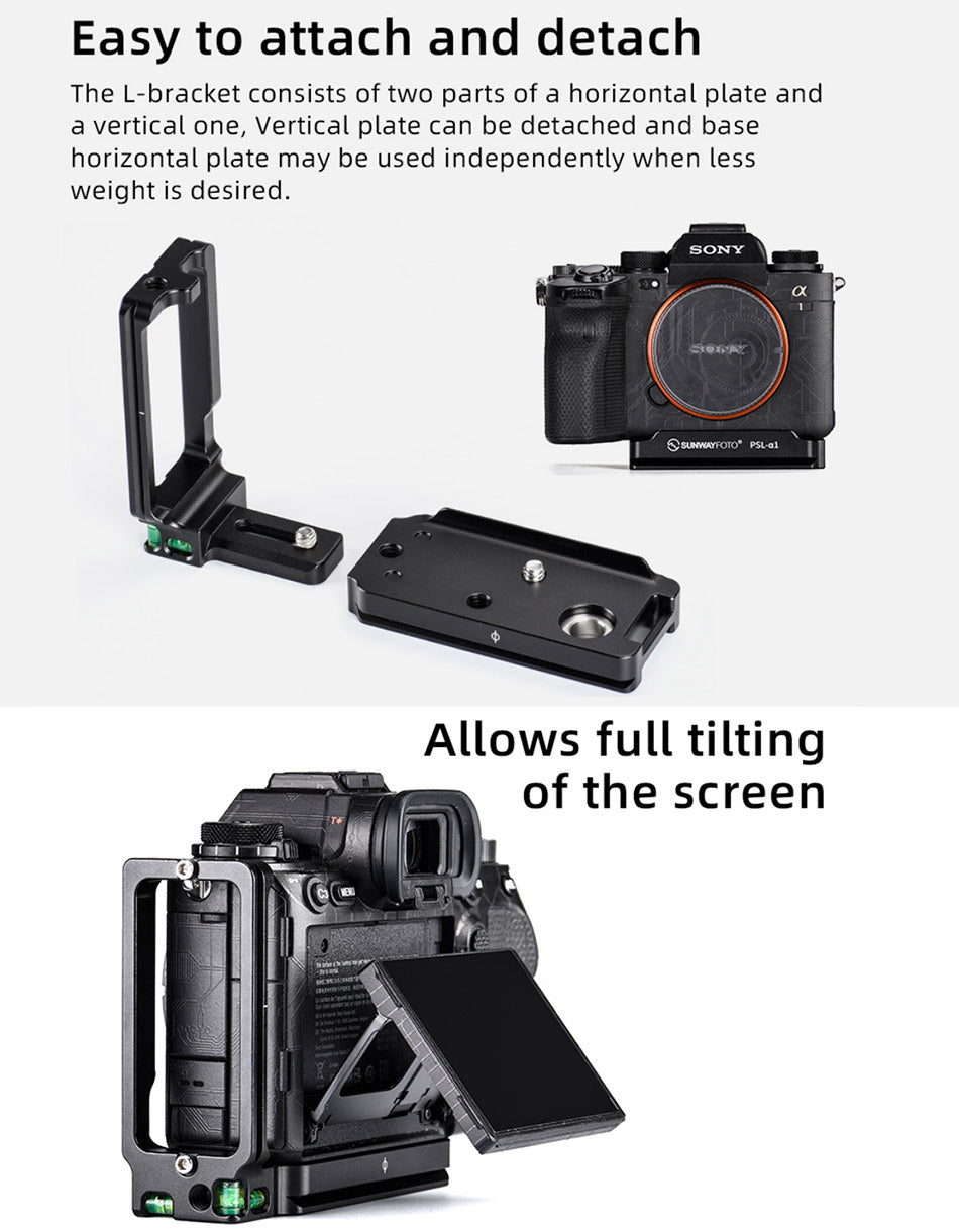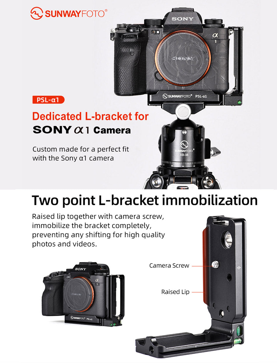 Sunwayfoto has been making dedicated L-brackets for Canon, Nikon, Sony and Fujifilm etc. camera brands, including Sony a1, a7, a7ii, a7riii, a7riv, a7rv, a6000, a6300, a6400, a6500 camera body L-brackets and a1, a7riv, a7rv camera body + battery grip vg-c4em L-brackets.