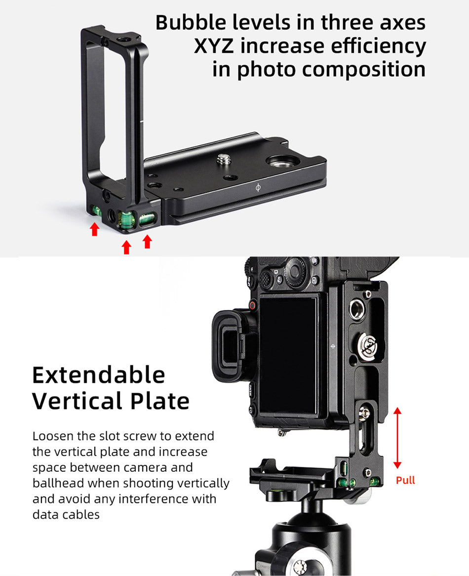 ✪Extendable Vertical Plate increases the space between camera and ballhead when shooting vertically, avoiding any interference with data cables.