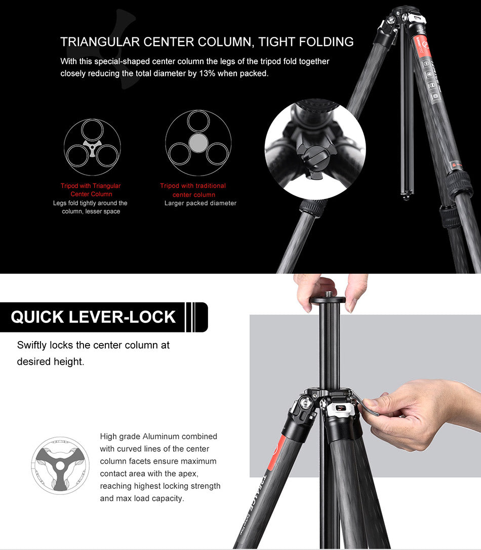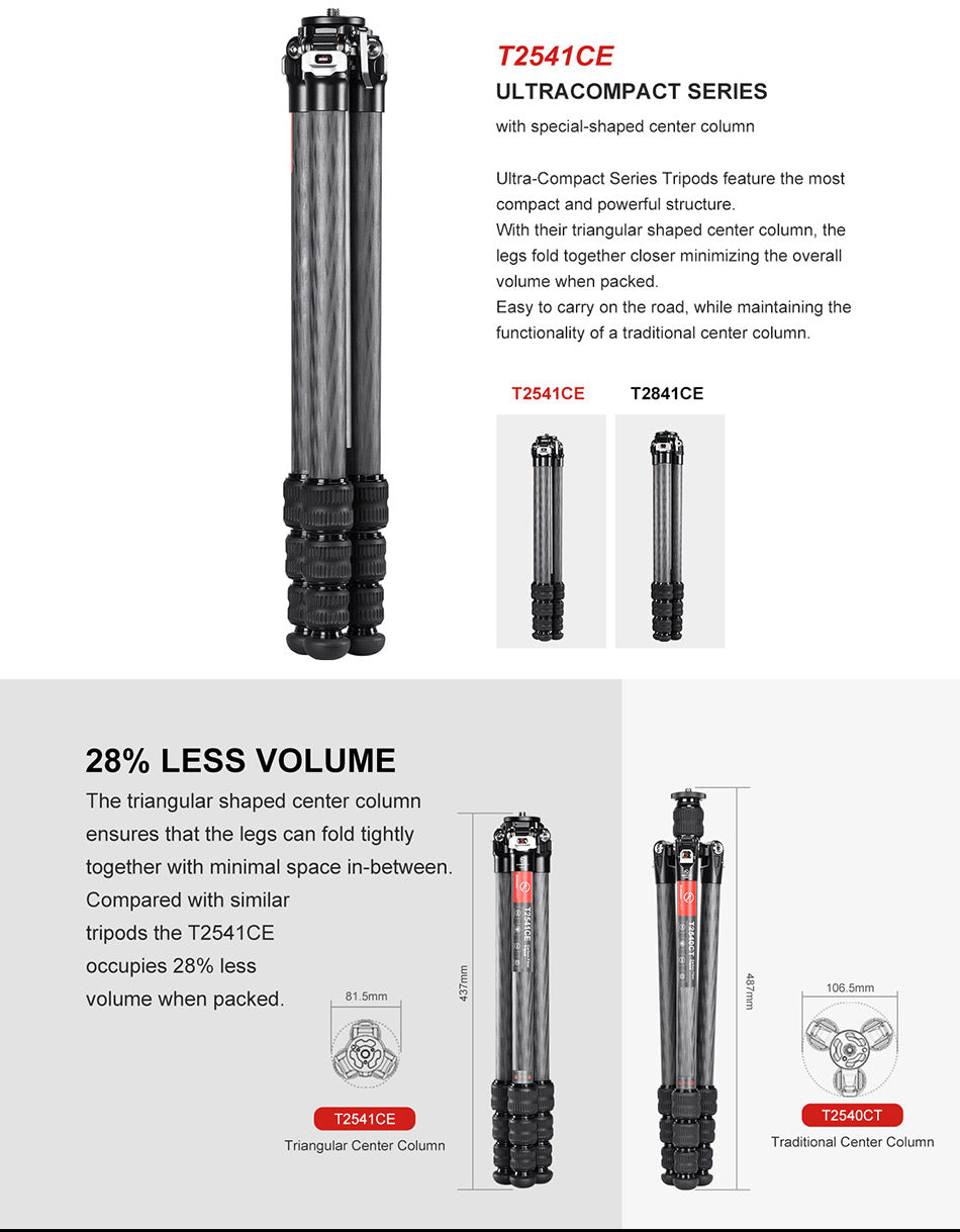 ✪ T6061 Aluminum and carbon fiber main body material, elaborately CNC machined, providing great stablity of the tripod. The triangular shaped center column ensures that the legs can fold tightly together with minimal space in-between. Compared with similar tripods the T2541CE occupies 28% less volume when packed.