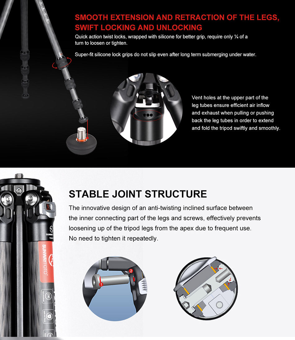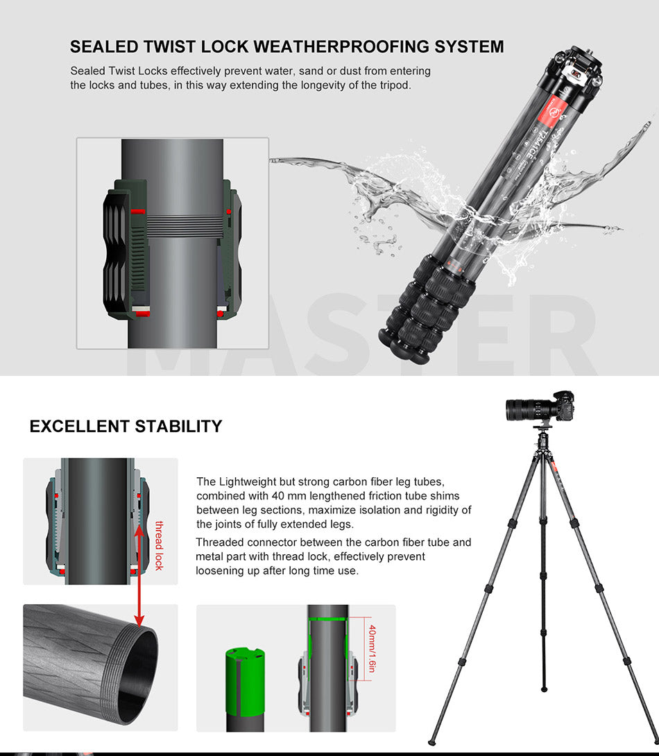 ✪Sealed Twist Locks effectively prevent water, sand or dust from entering the locks and tubes, in this way extending the longevity of the tripod.Stable joints design effectively prevents loosening up of the tripod legs from the apex due to frequent use.