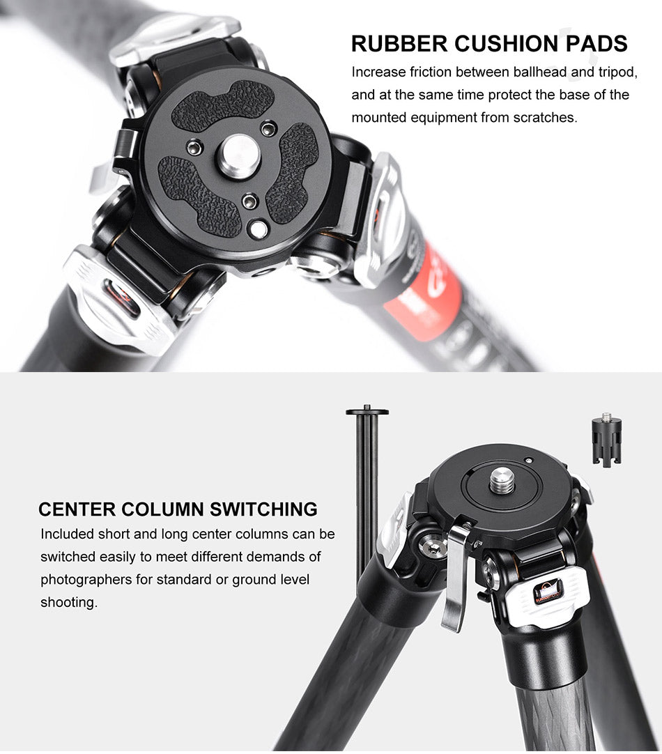 ✪ Included short and long center columns can be switched easily to meet different demands of photographers for standard or ground level shooting.