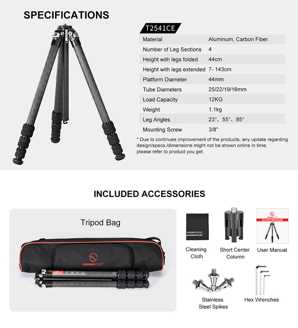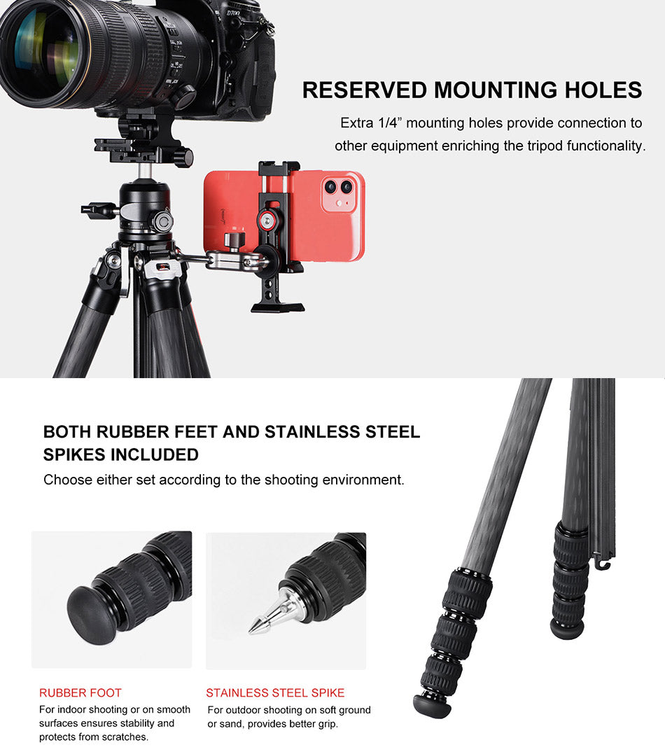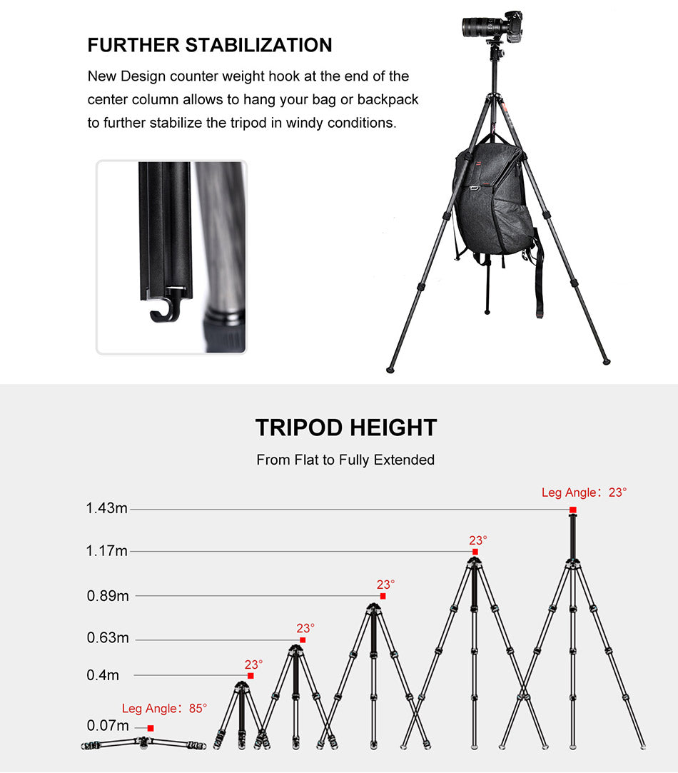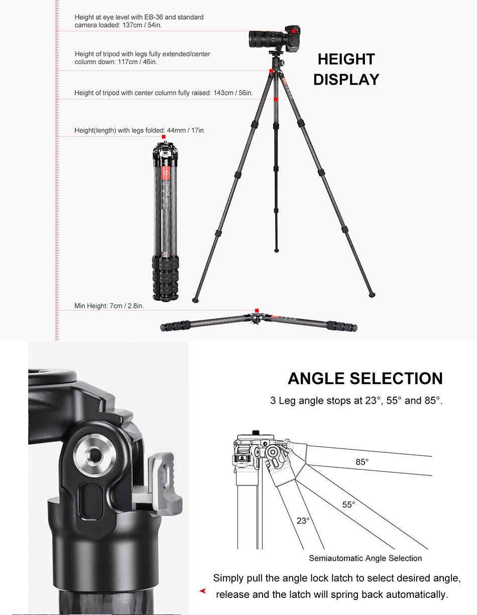 ✪ 4 Leg Sections with tube diameters of 0.63inch(16mm),0.75inch(19mm),0.87inch(22mm) and 0.98inch(25mm),reaching as low as 0.98inch(4cm) and max height of 0.98inch(143cm). 3 Leg Angles of 23, 55 and 85 for daily shooting. The lightweight but strong carbon fiber leg tubes, combined with 40mm lengthened friction tube shims between leg sections, maximize isolation and rigidity of the joints of fully extended legs. Load Capacity of 26.5lb(12KG).