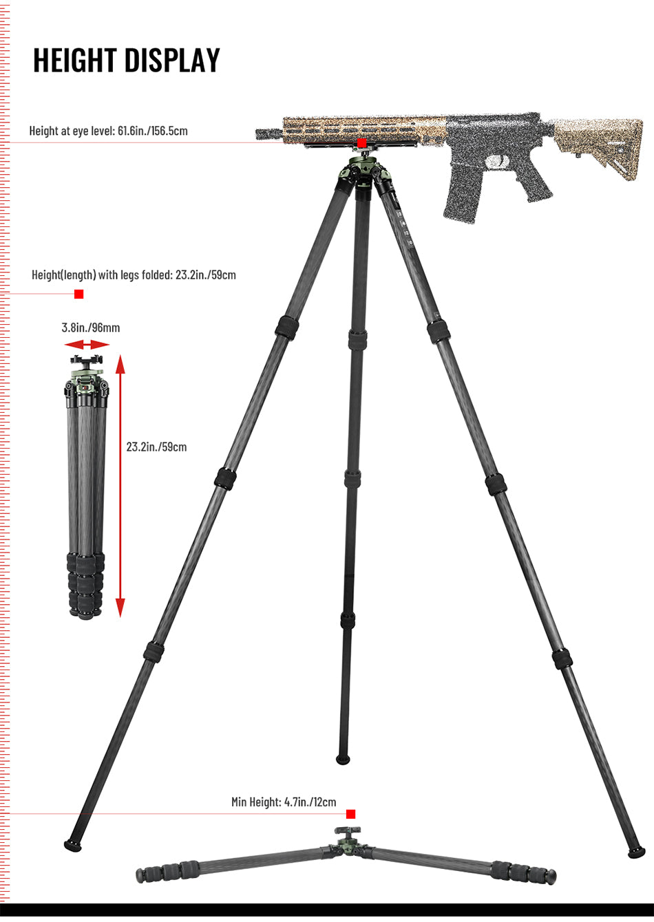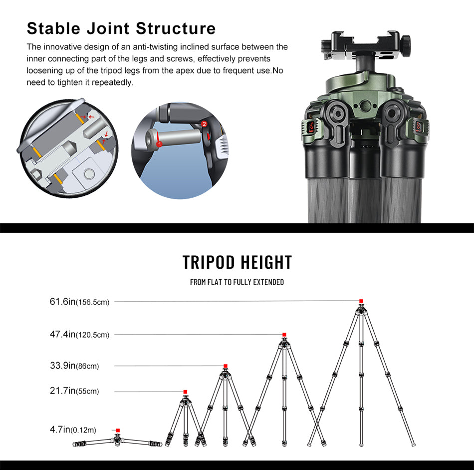 ✪4 Leg sections, 3 leg angles of (23/55/85), tripod height from 4.7-62in.(12-157cm)